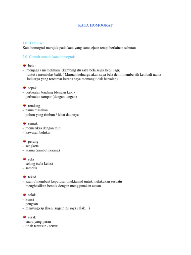 Contoh-contoh homonim dalam bahasa Melayu adalah seperti yang berikut. Hak 1 Bagian dari sepatu wanita 2 Sesuatu yang benar 3 Milik atau kepunyaan. Contoh sederhananya adalah kata Bulan.